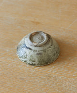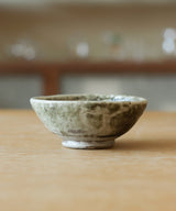 A rustic and unique small bowl. The outside has a textured and rustic green grey glaze. The inside has a textured and crackled green grey glaze.