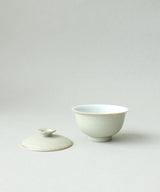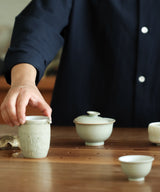 He throws the gaiwans on the potter’s wheel and shapes each gaiwan by hand from his own special formulation of Jingdezhen clay and porcelain clay. After bisque firing at 800°C, he applies his own glazes by hand. The gaiwans are then reduction-fired at 1300°C.