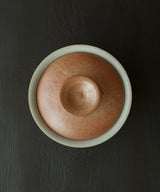 This gaiwan is striking in its form and colour. The outside glaze is opalescent with hues of a dusty sunset and is slightly textured. The inside is a soft, pale blue-grey glaze, with iron spots. Light crackles on the inside glaze will develop through use, and may darken with time.