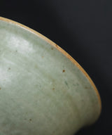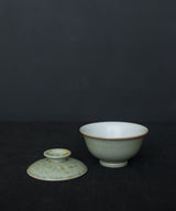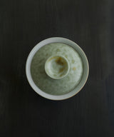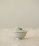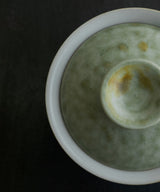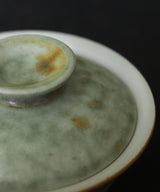 A special gaiwan with a unique shape. The outside is a pale sea-green glaze, matte with a slight sheen. The lid has tinted bronze spots.The inside is a soft, pale blue-grey glaze with iron spots. Light crackles on the inside glaze will develop through use, and may darken with time.