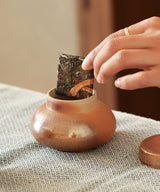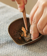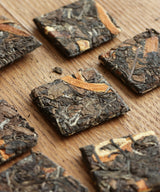 The tea leaves are combined with the aged peel (Chen Pi) of red mandarin oranges grown in Xinhui, Guangdong – the most well-known village for producing aged orange peel. Orange peels are revered as both a medicine and a deeply satisfying flavour in China. They must be aged for at least six years before being used in tea; any younger and their moisture and sugar content will cause the tea cake to grow moldy. Once combined with the tea leaves, they are pressed together into small, cookie shaped cakes.