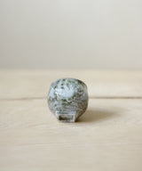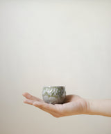 A stunning and unique tea cup. It has a bubbly and round body with a square footing. The outside is a shiny crackled grey glaze with green patches that remind us of moss. The inside is a shiny crackled dark grey glaze. Fitting nicely in the hand, it is a perfect size for small sips of tea over conversation with a friend, or as part of your morning ritual.