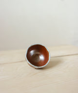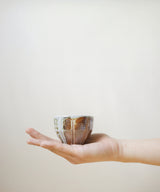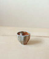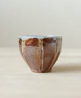 A beautiful tea cup with an elegant shape. The outside is a shiny dark brown glaze with hand cut ridges. The inside is a shiny bronze shino glaze. Fitting nicely in the hand, it is a perfect size for small sips of tea over conversation with a friend, or as part of your morning ritual.