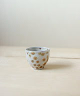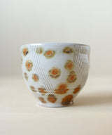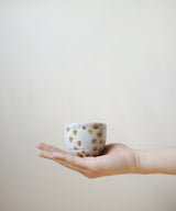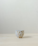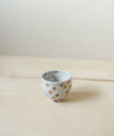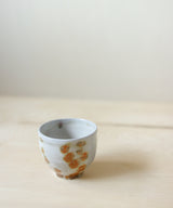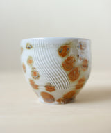 A stunning and elegant tea cup with beautiful orange iron spots that remind of mysterious leopards. The outside is a grey porcelain glaze with hand cut ridges. The inside is a minimal crackled grey glaze. Fitting nicely in the hand, it is a perfect size for small sips of tea over conversation with a friend, or as part of your morning ritual.