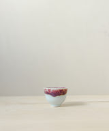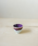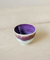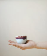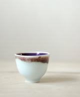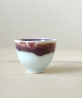An elegant tea cup with stunningly rich colors. The outside is a light blue celadon glaze with red and purple hues. The inside is a rich purple glaze. The shape is elegant and soothing to hold. Fitting nicely in the hand, it is a perfect size for small sips of tea over conversation with a friend, or as part of your morning ritual.