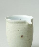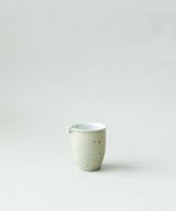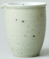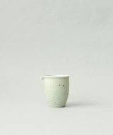 A beautiful one-of-a-kind pitcher crafted by Jingdezhen ceramicist Wang Xinghua. It has a delicate curved spout that offers extremely precise and controlled pours. The pitcher has an elegant matte green celadon glaze that Wang formulated himself. It has uniquely scattered freckles that arise from the iron rich clay body.