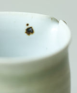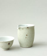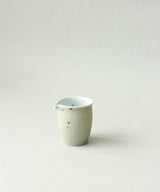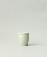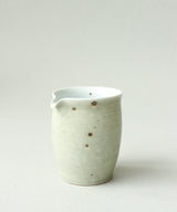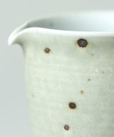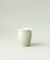 A beautiful one-of-a-kind pitcher crafted by Jingdezhen ceramicist Wang Xinghua. It has a delicate curved spout that offers extremely precise and controlled pours. The pitcher has an elegant matte green celadon glaze that Wang formulated himself. It has uniquely scattered freckles that arise from the iron rich clay body.
