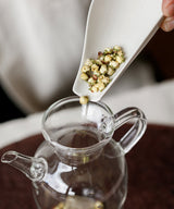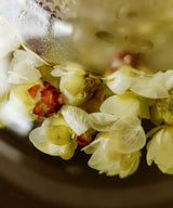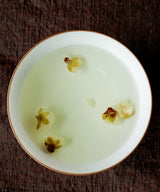 Plum blossoms are treasured for their poetic significance and their medicinal benefits. They are known to calm the liver and stomach, and clear heat and dryness from the body. The taste of them is very soothing, with incredible notes of green almond and toasted apricot kernel.
