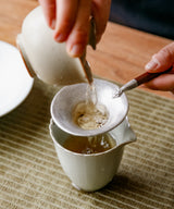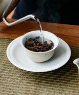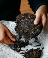 Tang harvests his Purple Buds as one bud and two or three leaves early in the spring, when the leaves are soft and rich in substance. After harvesting they are spread thinly on bamboo mats and naturally withered indoors. The density of this tea makes the withering process particularly long, usually happening over the course of a week. The slowness with which the tea withers means that the active enzymes in the leaves undergo gradual oxidation and hydrolysis without being damaged. Once the leaves are between 80 and 90 percent dry the leaves are roasted over charcoal for 6 hours. Then the tea is left to sit for 2 weeks, before being pressed into a cake.