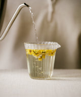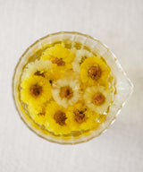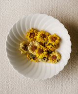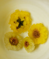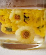 We smell the warmth and sunshine in these perfectly dried, compact little flowers. It is very cheerful to watch them expand in the water, their thin yellow petals buoyantly dilating together. The tea they brew is extremely pleasing – it tastes warm and sunbaked, like hay and candied orange peel. At the back of the throat it causes a lifted, sweet, cooling sensation that makes us want to continue sipping it, just for the tingles it brings. Pearl chrysanthemum tea is both enervating and relaxing, much like high mountain sun.