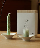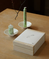 A beautiful Gift Set that comes in a wooden box. The set include: 2 "Blossoms" Mini Plate/Candle Holder and two hand-poured candles. The candles are handcrafted, unscented and the colours are achieved with natural minerals. Burn time is approximately 8 hours for each candle.