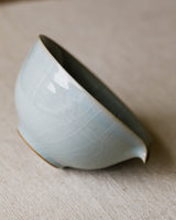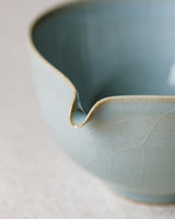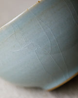 A beautiful one-of-a-kind bowl for making matcha latte crafted by Jingdezhen ceramicist Wang Xinghua. In a stunning new glaze: slick, cool and shiny, like a frozen lake with veins of disturbance running through it.