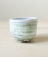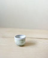 A beautiful tea cup with subtle yet elegant colors. The outside is a light grey glaze with swirls of light green. The inside is grey white glaze with iron spots. Fitting nicely in the hand, it is a perfect size for small sips of tea over conversation with a friend, or as part of your morning ritual.