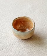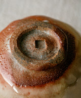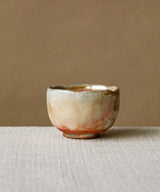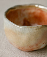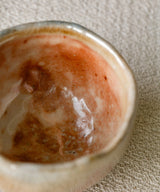 This stunning cup has a beautiful shape that fits perfectly in the hands. The shino glaze emerged from the kiln with soothing peach-colored hues and unique cracklings.
