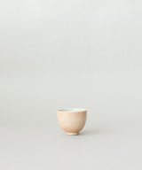 A minimal and classic small tea cup with a beautiful sunrise-colored glaze on the outside. The inside is a soft, pale blue-grey glaze with small iron spots. Light crackles on the inside glaze may develop through use, and may darken with time.