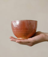 Shiny, red-orange shino glaze on the outside with textured ridges. Subtle pale ice blue glaze on the inside.