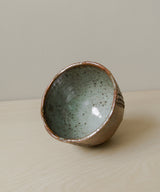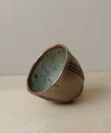 Albany slip glaze on the outside with highly textured ridges. A beautiful pale blue-green clear glaze on the inside with small brown speckles, reminding us of quail egg shells.