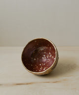 A rustic and striking chawan. Soda clay body with feldspar chunks. The outside is heavily textured and feels rugged in the hands. The inside is a dark maroon shino glaze with textured white speckles.