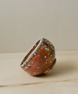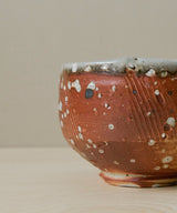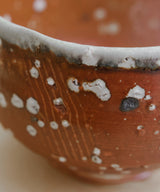 An unique, striking chawan. Soda clay body with feldspar chunks. The outside is deep orange shino glaze with textured white speckles. The inside is a shiny orange shino glaze with white speckles and iron spots.