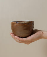 The outside is glazed with Albany slip glaze, rust brown colored with hand carved wavy ridges that are slightly textured. The inside is a black tenmoku glaze.