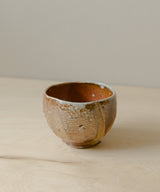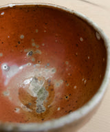 The outside is brown with yellow stripes and white speckles. The inside is an orange-red shino glaze with white and darker speckles.