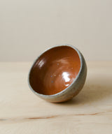 The clay body is a special soda clay body made by Danny. The outside is mostly matte colored and two-toned - orange shino glaze on one side, and a slightly textured grey color on the other side. The inside is shiny shino glaze with a few speckles.