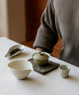 We have long admired Wang’s ceramics for being rooted in daily life: his adept craftsmanship is dedicated to making something very simple, and a large part of his pottery’s elegance is in how well it functions. This holds true on every level of detail: beyond how the lid and cup might fit perfectly together, into how they sit so comfortably in the hand of the person making tea, or how the wet leaves vividly appear against the matte-white glaze of the vessel. These pieces are meant to be used every day, for many years, and have an aesthetic warmth to them that indicates this – an inviting quality well suited to vessels, and that we may best describe as “open.”
