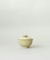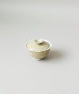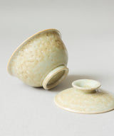 A beautiful gaiwan in a textured sand-coloured glaze, handmade by ceramicist Wang Xinghua. The inside is a soft, pale blue-grey glaze with small iron spots. Light crackles on the inside glaze will develop through use, and may darken with time.