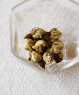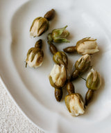 Drinking the tea of white roses is an enchanting experience: it is both more subdued and more sweet than tea from a red rose. These buds brew a muted, golden liquor that feels silky in the mouth. The tea is very pretty, and very floral, with undertones of clover honey and hay.