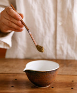 A beautiful one-of-a-kind bowl for making matcha latte crafted by Jingdezhen ceramicist Wang Xinghua. The "chawan" has a spout, and is meant to be used for making matcha for a matcha latte.