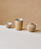 We have long admired Wang’s ceramics for being rooted in daily life: his adept craftsmanship is dedicated to making something very simple, and a large part of his pottery’s elegance is in how well it functions. This holds true on every level of detail: beyond how the lid and cup might fit perfectly together, into how they sit so comfortably in the hand of the person making tea, or how the wet leaves vividly appear against the matte-white glaze of the vessel.  These pieces are meant to be used every day, for many years, and have an aesthetic warmth to them that indicates this – an inviting quality well suited to vessels, and that we may best describe as “open.”
