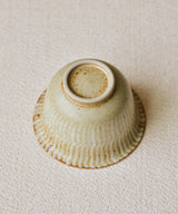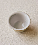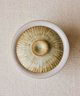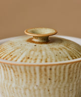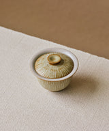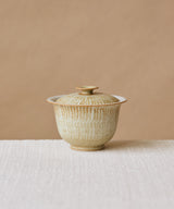 A beautiful one-of-a-kind gaiwan crafted by Jingdezhen ceramicist Wang Xinghua.  A new glaze from Wang for our new collection, a surface that mimics the spiral of a seashell, bleached and burnished by the sun. This glaze feels beachy and sunkissed, with beautiful markings from the kiln fire that add to its organic, intertidal appeal.