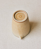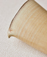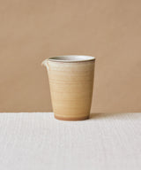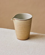 A beautiful one-of-a-kind pitcher crafted by Jingdezhen ceramicist Wang Xinghua. A muted, sand-toned glaze with strata that seemed formed by calcification. The subtle rings culminate in a thin dark line marking the lip of the vessel. It has a delicate curved spout that offers extremely precise and controlled pours.