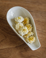 It is an absolutely stunning year for these chrysanthemum flowers: they smell sweet, deep, and look perfectly orb-like when dry. The blossoms open quickly in water, expanding into incredibly fluffy flowers that look buoyant and alive. They brew an electric looking liquor that has taken on the lemonade colour of the flower’s robust inner petals.
