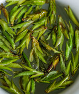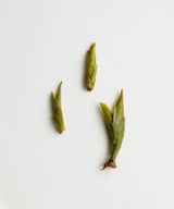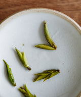 Prized for its energetics, and for offering us such a direct experience of ancient pu’erh trees, this year’s harvest of Daxueshan also delivers a shocking amount of flavour. The dense, freshly harvested buds are bright green with a streak of purple running along one side. They float in the gaiwan like small boats, and smell as though they are carrying an import of tropical fruit.