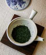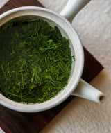 This is the entry level Gyokuro from Dento Hon. Dry, it smells delicious: toasty and direct. Its first infusion tastes very deep, dominated by soft, low green notes. Its flavour profile references algae and popcorn. This is a less complex gyokuro than others we carry from this producer, and well suited for everyday drinking. It offers us a very pleasant dose of umami, L-theanine and chlorophyll.