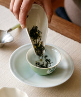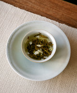 The tea Master Bai made is very pretty, the white flowers remain speckled throughout the darkened green tea leaves. For those of you who enjoy an intense tea, an intense moment, or the enveloping scent of jasmine absolut – this tea is for you. The soft, milky mouthfeel of this year’s harvest delivers an incredible amount of flavour and aroma, for which we have the porosity of Maofeng from Mengding Mountain and the meticulous process by which it has been scented to thank. When we wonder why Jasmine Tea is as internationally ubiquitous as it is, we can look to traditional teas like this one for an answer.
