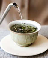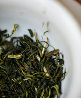 Looking at the dried tea you will see that it is more rustic: the fine green leaves are curved and variegated in colour, with some stems mixed in with them.