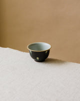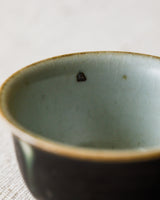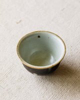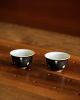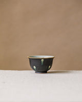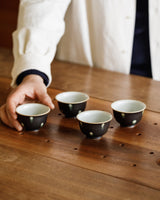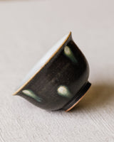 A beautiful tea cup crafted by Jingdezhen ceramicist Wang Xinghua. A matte black glaze marked evenly with white spots that have slick green rings, like the decporative, deceptive irises on a peacock feather. A wonderful and very unique set with their matching gaiwan, unlike anything we’ve seen from Wang’s studio before.
