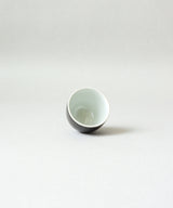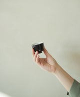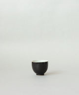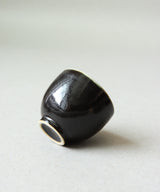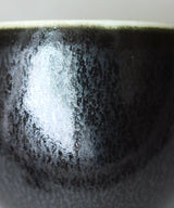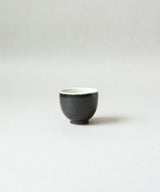 A minimal and classic small tea cup with a stunning cosmos black glaze on the outside. The inside is a soft, pale blue-grey glaze with small iron spots. Light crackles on the inside glaze may develop through use, and may darken with time.