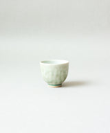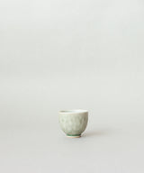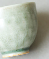 A minimal and classic small tea cup with a unique coral green glaze on the outside. The inside is a soft, pale blue-grey glaze with small iron spots. Light crackles on the inside glaze may develop through use, and may darken with time.