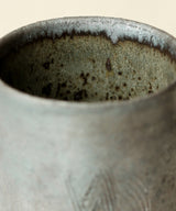 Wei throws each cup carefully by hand. The pieces are air-dried for 3 days until they are bone dry before trimming and then bisque firing. The cup was wood-fired for 3 days in the kiln, with temperatures maintained at 1400 degrees Celsius. It took 3 additional days for the wood-fired kiln to slowly drop in temperature, so each piece spent a total of 6 days in the kiln. The cup goes into the kiln without any glaze on the outside and emerges with its own unique color, texture and sheen from the atmosphere inside the kiln.