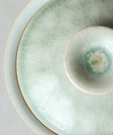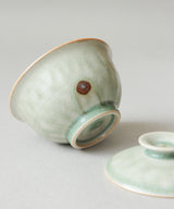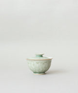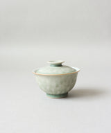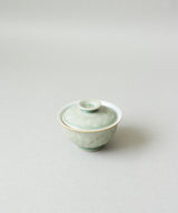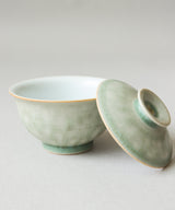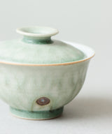 A stunning gaiwan with an unique green glaze that resemble coral reefs. The inside is a soft, pale blue-grey glaze with small iron spots. Light crackles on the inside glaze will develop through use, and may darken with time. Please note that this specific gaiwan has a very distinct iron spot on the body, the diameter of this larger iron spot is approximately 1'', as shown in the image.