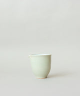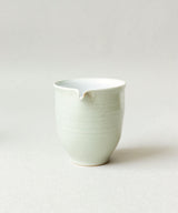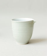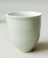 He throws the pitchers on the potter’s wheel by hand from his own special formulation of Jingdezhen clay and porcelain clay. After bisque firing at 800°C, he applies his own glazes by hand. The cups are then reduction-fired at 1300°C.