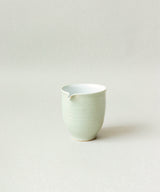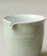 A simple, classic and minimal pitcher with a round curved body, and a delicate spout that offers precise and dripless pours. It has an elegant light green glaze on the outside, and a delicate, soft, pale-blue-grey glaze on the inside with subtle crazing and tiny scattered freckles that arise from the iron rich clay body.