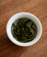 The robust, spindly leaves of this green tea unfurl and glisten in the water, actually appearing a bit like a silver dragon might. The baking process the tea went through is felt in the warmth and depth of its liquor. It has an incredibly floral nose, a scent distinct to many Taiwanese teas, which invites a perfumer’s approach to tasting it. This tea will be enjoyed as much for its compelling fragrance as for its feel.
